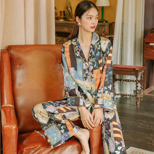 MAISON GABRIELLE 2020 Abstract Printed Silk Satin Pajamas Set Long-Sleeve 2-Piece Loungewear For Women Top And Pants Spring